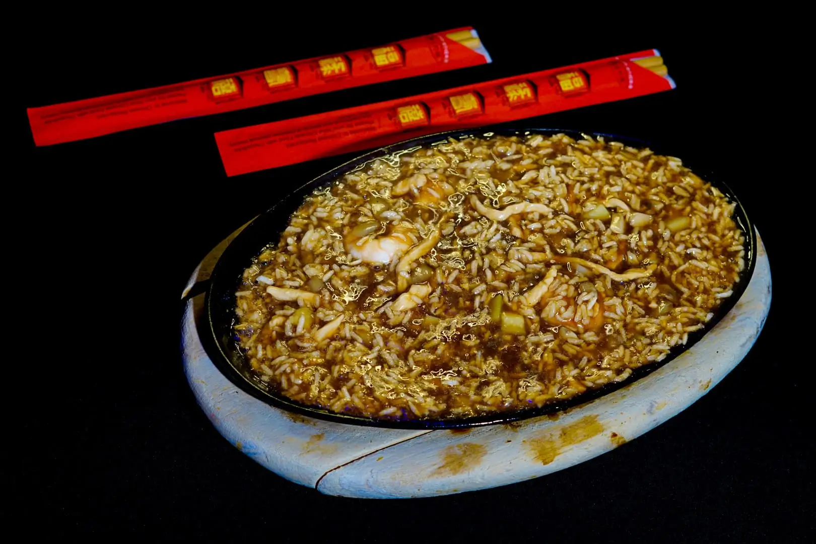 Base de arroz crujiente acompañada de jamón, gambas y tortilla, todo salteado en salsa suave para crear un plato completo y muy sabroso.