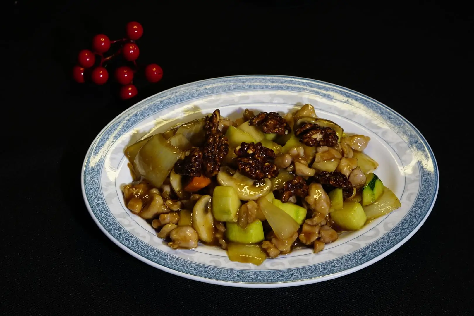 Pollo salteado con nueces, combinando textura crujiente y sabor suave.